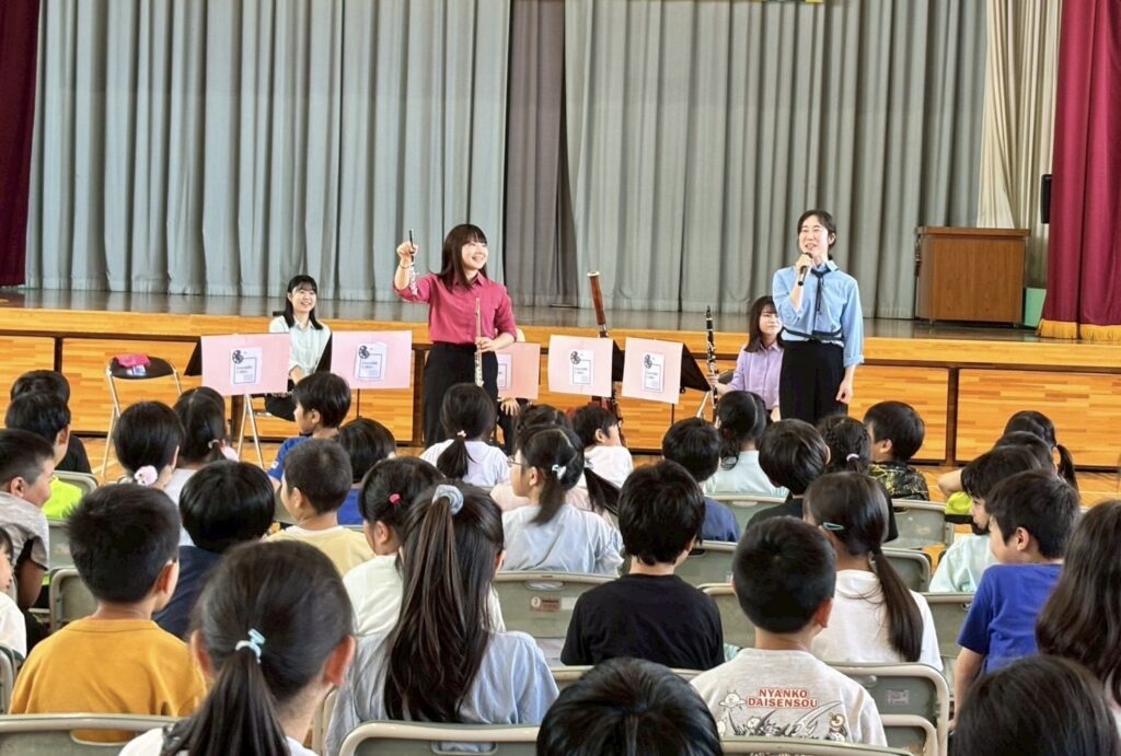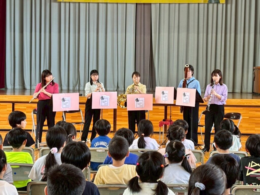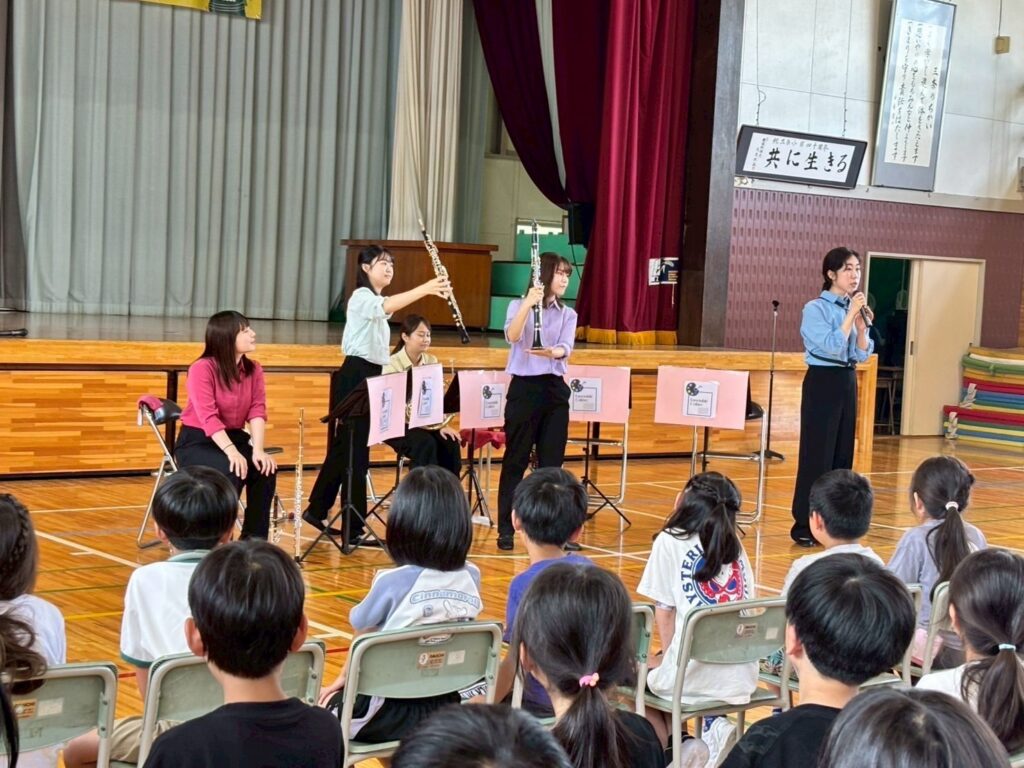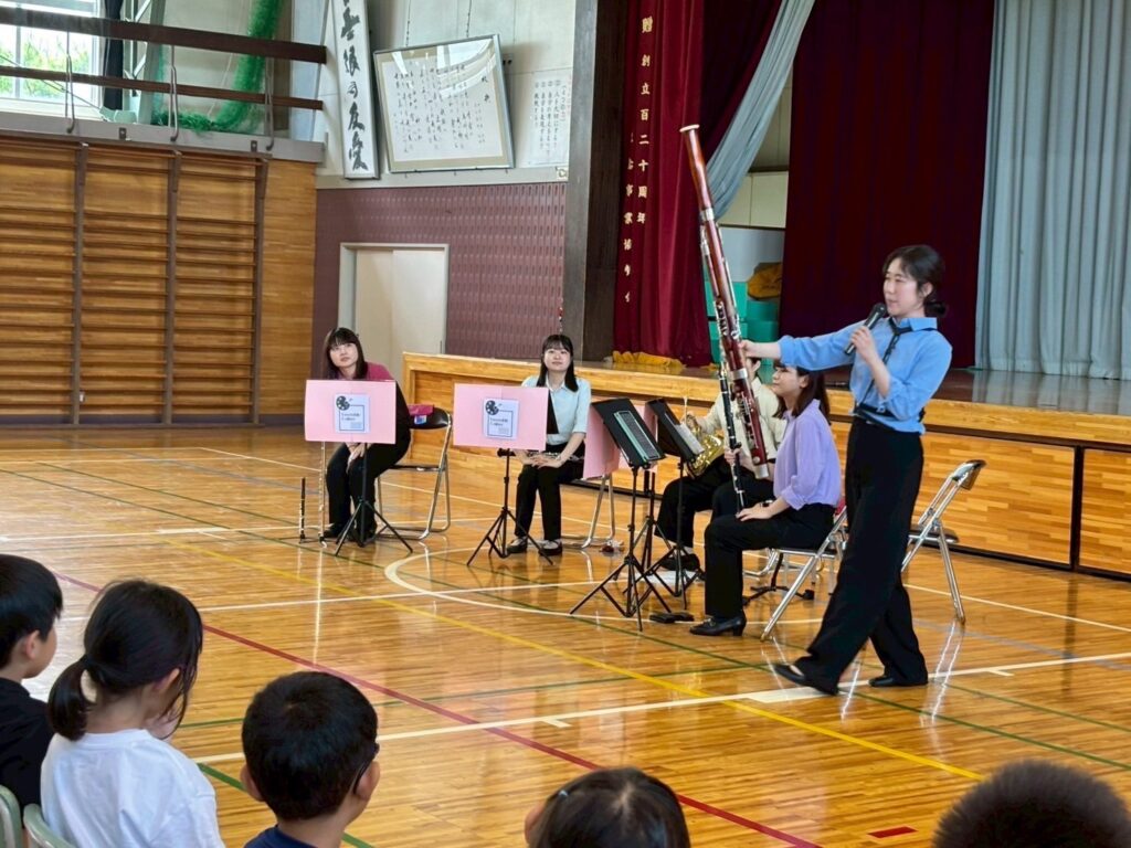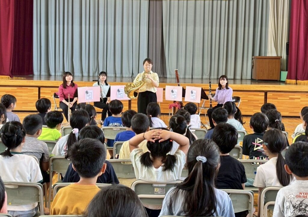 小学校では、演奏と一緒に生徒の皆さんにお歌を歌ってもらったり、アンコールのラデツキー行進曲で拍手をしてもらったりと、”聴くだけ”ではなく、身体を使って音楽を楽しんでもらいました!演奏後には、生徒の皆さんから感想を言って下さり、「もっと聴きたかった」や「この曲が綺麗で好きだった」等のコメントに、メンバー一同、心がじんわりと温かくなり、とても嬉しかったです。